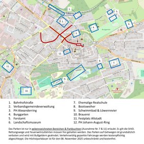Die Höchstparkdauer ist für den 8. November 2025 in den oben aufgeführten Bereichen aufgehoben – das Parken ist damit an diesem Tag in den genannten Zonen kostenfrei und zeitlich unbegrenzt.