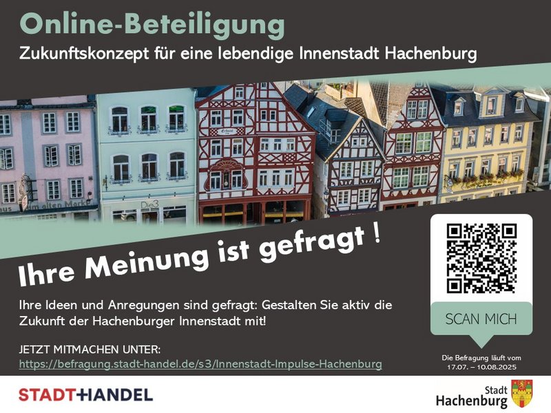 Online-Umfrage: Ab sofort ist die Beteiligung auch online über den folgenden Link oder durch Scannen des QR-Codes möglich: https://befragung.stadt-handel.de/s3/Innenstadt-Impulse-Hachenburg