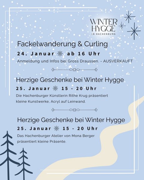 Hygge Markt – Kunst & Herziges am Sonntag (25.01.26 von 15-20 Uhr) Die Hachenburger Künstlerin Rithe Krug präsentiert kleine Kunstwerke (Acryl auf Leinwand). Das Hachenburger Atelier von Mona Berger bringt herzige Geschenkideen und liebevolle Präsente mit.