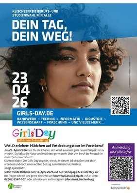 Am Girls'Day, den 23.04.26, öffnet das Forstamt seine Türen für Mädchen und junge Frauen, die einen spannenden Blick hinter die Kulissen werfen möchten. Die Teilnehmenden lernen verschiedene Berufe im Forst kennen - von der Arbeit unserer Försterinnen über die der Forstwirtinnen im Wald bis hin zu Aufgaben in Planung, Naturschutz und Holzmanagement. Der Girls'Day 2026 bietet eine einmalige Gelegenheit, die spannenden Möglichkeiten in der Forstwirtschaft kennenzulernen und sich für die Zukunft unserer Wälder einzusetzen.