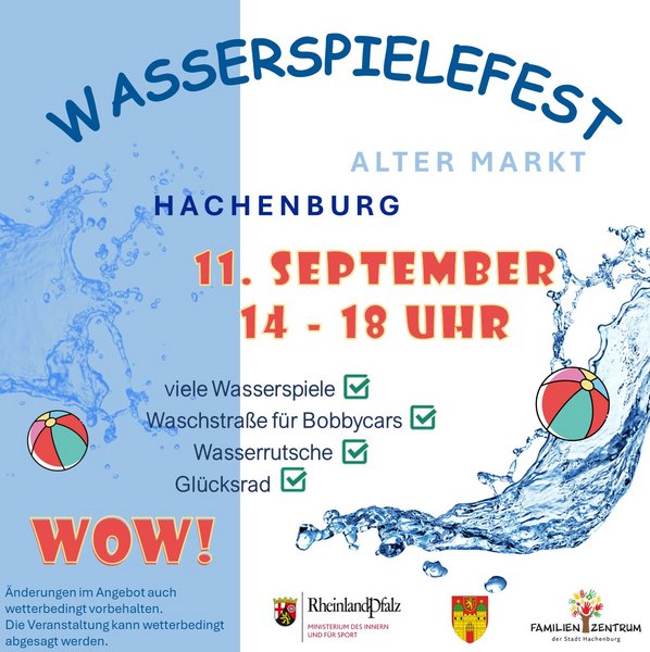 Die Stadt Hachenburg hofft auf viele Besucher und sieht in diesem Fest nicht nur eine Bereicherung für die Kinder, sondern auch einen Beitrag zur Belebung der Innenstadt und zur Familienfreundlichkeit unserer Löwenstadt. Unterstützt wird das Wasserspielefest im Rahmen des Modellvorhabenns „Innenstadt-Impulse“ durch Fördermittel des Ministeriums des Inneren und für Sport Rheinland-Pfalz und ist somit die erste Maßnahme, die aus dem Förderprogramm in der Stadt Hachenburg umgesetzt wird.