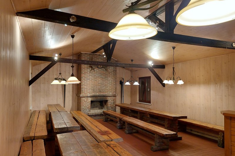 Kamin, Kühltheke sowie zwei Toiletten sind vorhanden. Ein großes Vordach mit Sitzgelegenheiten bietet sich für sehr verregnete Tage als Regenschutz an.